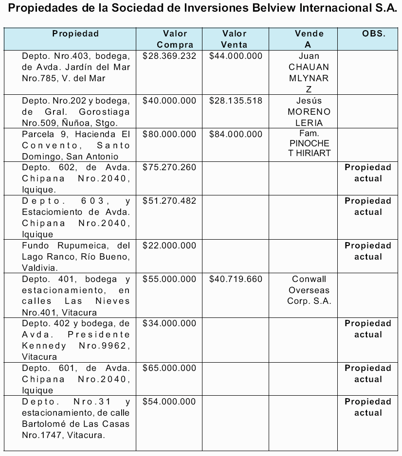 b.- Representada por un mandatario, María Lucía HIRIART RODRIGUEZ, en el año 1992, compra el Departamento Nro.202, bodega 5, ubicados en calle General GOROSTIAGA y en el año 1994 representada por Gabriel VERGARA CIFUENTES secretario personal de Augusto PINOCHET UGARTE, vende este departamento a La Sociedad de Inversiones Belview S.A., representada por José SOBARZO POBLETE. Esto es, vende el inmueble a Belview S.A., sociedad chilena cuyo dueño es Augusto PINOCHET UGARTE a través de la sociedad extranjera con acciones al portador Belview Inc, por lo cual continúan, junto a su cónyuge, como dueños, pero a través de la sociedad chilena referida, hasta el año 1997, fecha en la cual se vende a una tercera persona. Operaciones en las que se evita se conozca el real propietario de la inversión, imposibilitando al Servicio de Impuestos Internos realizar su labor fiscalizadora y recaudadora de impuestos.