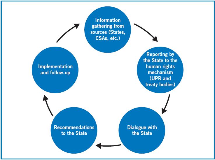 A holistic approach makes use of the plurality of human rights mechanisms, rather than focusing on the recommendations of just one. It involves engagement with human rights mechanisms in all phases of their work. Human rights mechanisms work in cycles that can be simplified in phases of: information gathering, reporting, dialogue with the concerned State, recommendations and follow-up.