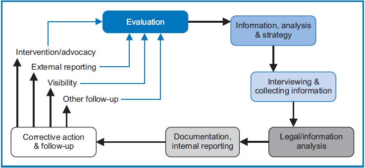 Monitoring the State's implementation of recommendations is an important activity for civil society to ensure Government's accountability. It can consist of CSAs' keeping up to date on whether the State has ratified a specific human rights treaty, has extended invitations to special procedures to visit the country, has adopted a law on non-discrimination; or carrying out complex monitoring processes involving the collection and corroboration of large amounts of data from different sources and in multiple locations, or analysis of information in relation to indicators and benchmarks over a defined period of time. Whatever type of monitoring is undertaken, simple or complex, it is vital that findings are accurate and reliable. The findings can serve as the basis for advocacy with the national Government, and may be developed as submissions to human rights mechanisms, e.g. in the second or third cycles of the UPR, for the following review of treaty bodies, as an oral update to the Human Rights Council. OHCHR's Manual on human rights monitoring |5| provides detailed guidance on monitoring methodology as the active collection, verification, analysis and use of information to assess and address human rights concerns. According to this definition, monitoring takes place over a protracted period of time. The whole process of monitoring is also referred to as the human rights monitoring cycle (see below).