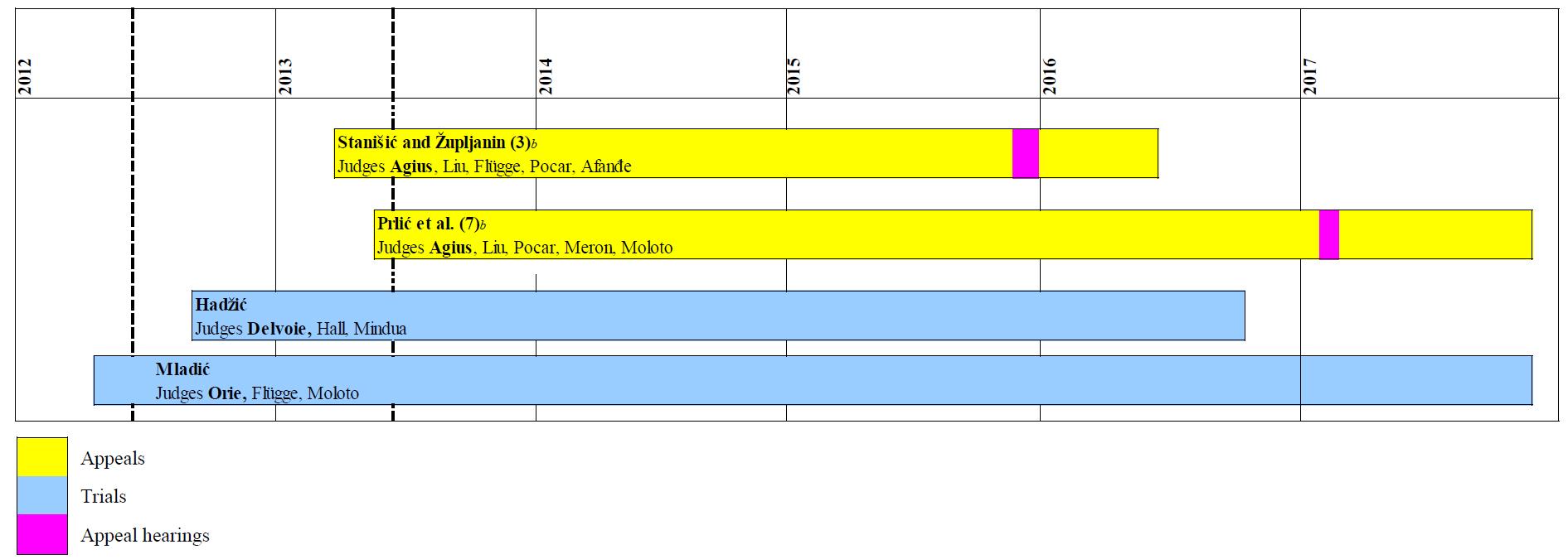 25. In the case of Prosecutor v. Jadranko Prlić et al., the projected time frame for delivery of the appeal judgment remains November 2017, as indicated in previous reports. This is the most voluminous appellate case in the history of the Tribunal, with seven appeals (one by each of the six defendants, as well as the prosecution), 172 grounds of appeal, and 12,196 pages of appellate submissions dealing with a trial judgment of more than 2,000 pages. It will be a challenge to meet the projected time frame with no slippage whatsoever, yet the Appeals Chamber remains committed to completing the case by November 2017. While the deployment of additional experienced staff on a staggered basis with the completion of other cases had to be postponed owing to delays in those cases, the drafting of the preparatory document analysing the parties' appellate submissions is on track. Measures were taken to increase the number of staff assigned to this case and to have a core leadership of the team that includes staff members with extensive experience in working on voluminous appellate cases. However, as with the Mladić case, it will become increasingly difficult to maintain the continuity of core staff as the Tribunal's mandate draws to a close. The loss of experienced staff in such a complex and voluminous case will present significant challenges.