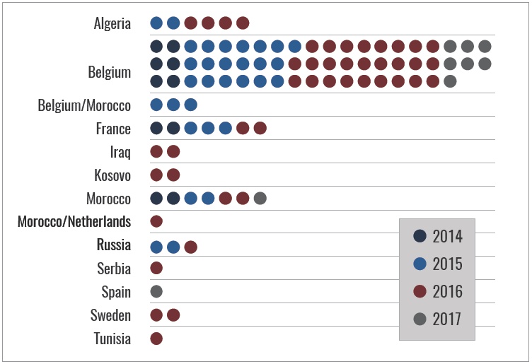 Another important thread in the citizenship data are the countries whose citizens appear consistently across the June 2014 to October 2017 timeframe. There are only two countries–Belgium and Morocco–whose citizens appear across each of those four years. In addition to these two countries, France is the only other country whose citizens appear across three years in the dataset, a finding that speaks to the Belgian-Moroccan-French Islamic State nexus that the group has leveraged to gain influence, and to execute a number of attacks, in the region.